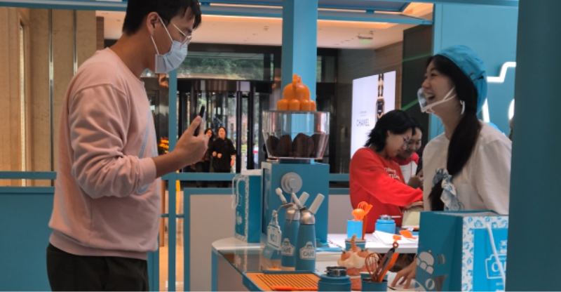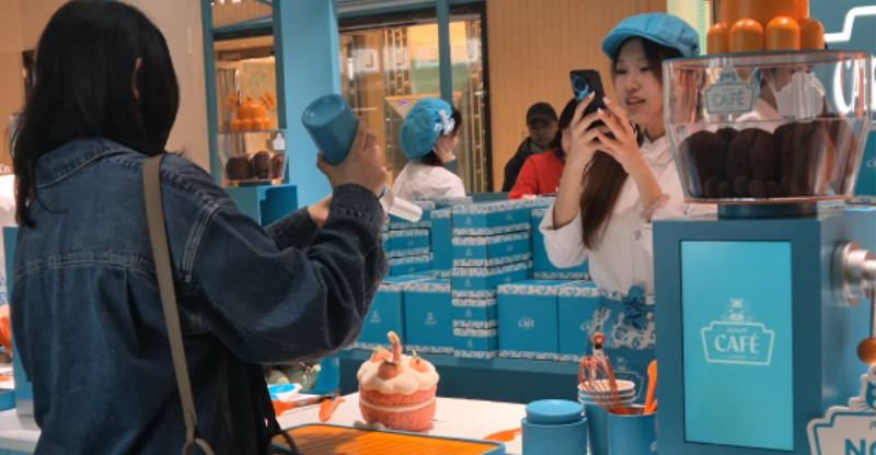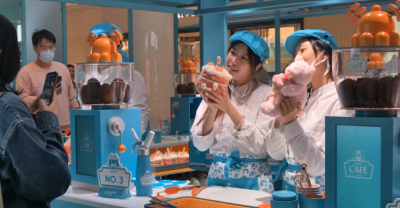 Na saída de um café, demos de cara com uma fila longa de jovens esperando para entrar em dois stands da Jellycat, marca de brinquedos premium, que simulavam um café. Pesquisei e verifiquei que é um pop-up experiência da marca em várias cidades como Paris, Londres, NYC e aqui na China. Os jovens da fila – com agendamento prévio via app – escolhiam um brinquedo e a experiência com um bolo de brinquedo. Até aí nada de diferente. Só que, quando chegamos mais perto, notamos que as meninas que serviam o dito bolo fingiam que estavam decorando-o. O cliente ajudava a “montar o bolo”, fazendo movimento com as espátulas no ar, colocando creme chantilly de mentira – como quando fingimos para crianças pequenas que estamos cozinhando com elas. As atendentes cantavam uma música e após diversos aplausos colocavam o tão elaborado bolo numa caixa cheia de laços. Tudo devidamente filmado, claro. Até onde eu encontrei nas minhas pesquisas, a experiência que relatei não acontece nas outras cidades.